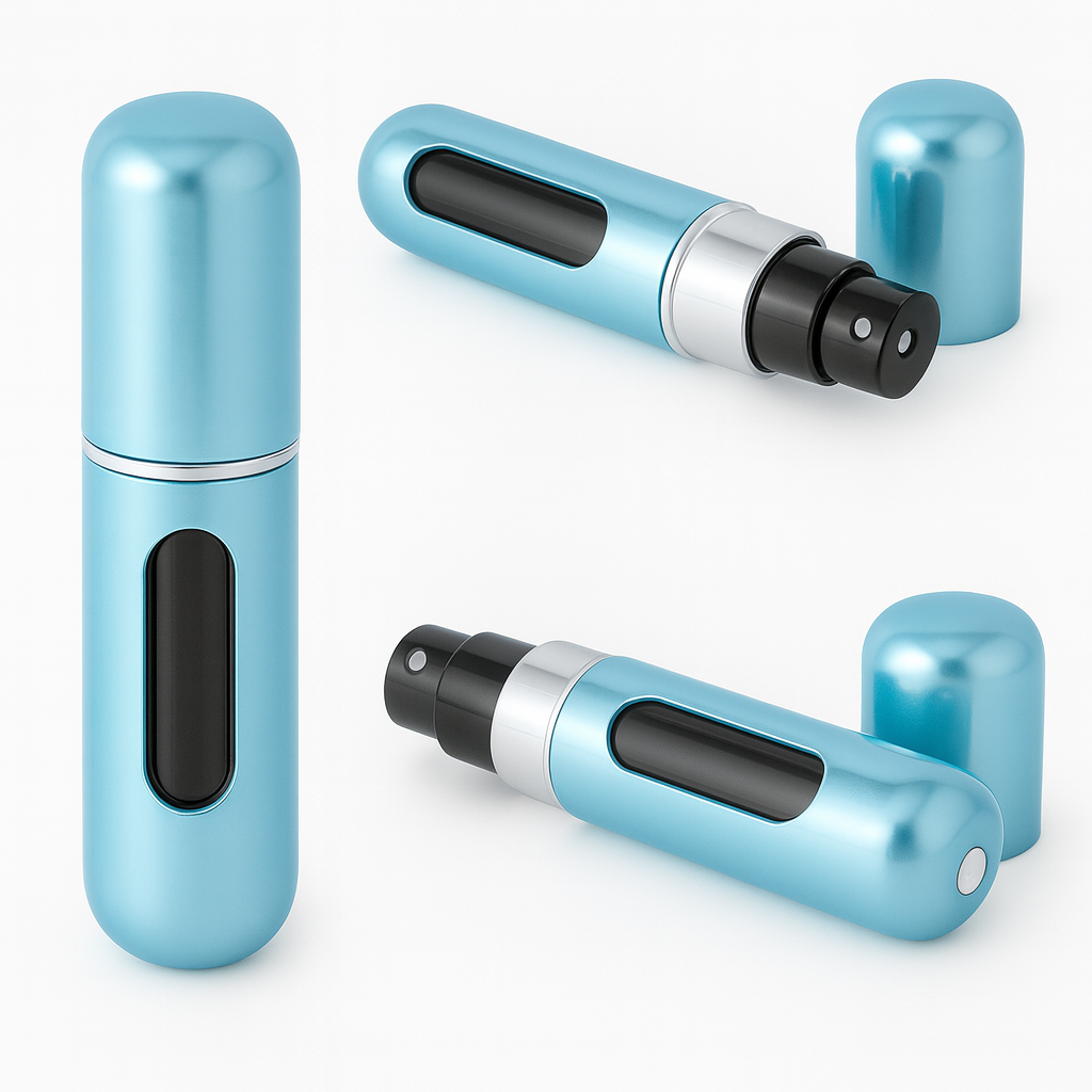 PERFUMERO COLOR CELESTE BRILLANTE PORTATIL AUTO RECARGABLE EN SPRAY 5ML
